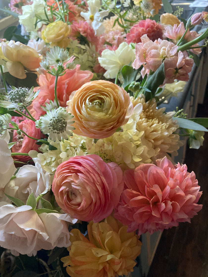 We provide bucketed flowers for wedding and events in bunches of ten. Contact me so I can tell you more about what’s seasonally available, and how to price your event.
