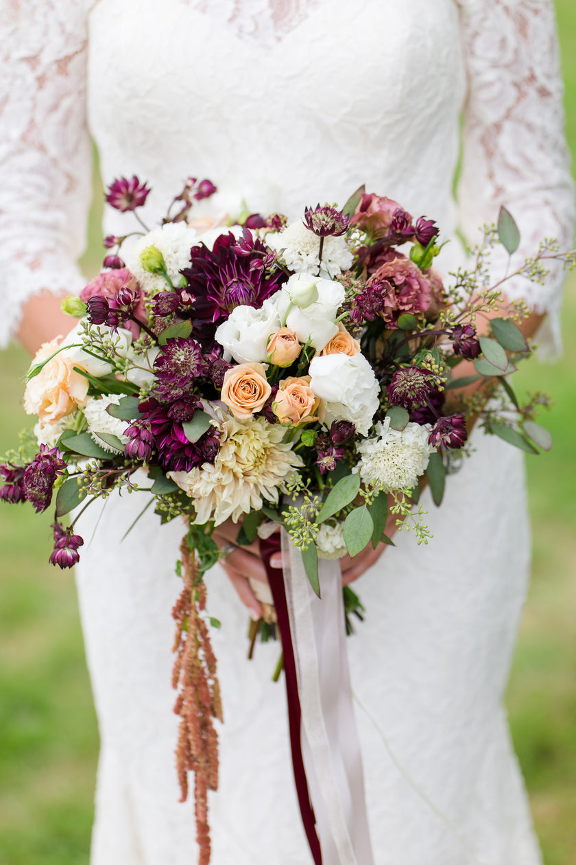 Attendant Bouquet: Styled in similar fashion to the bride’s bouquet, with fewer focal flowers, but the same elegance. Wrapped with ribbon, tails optional. $95