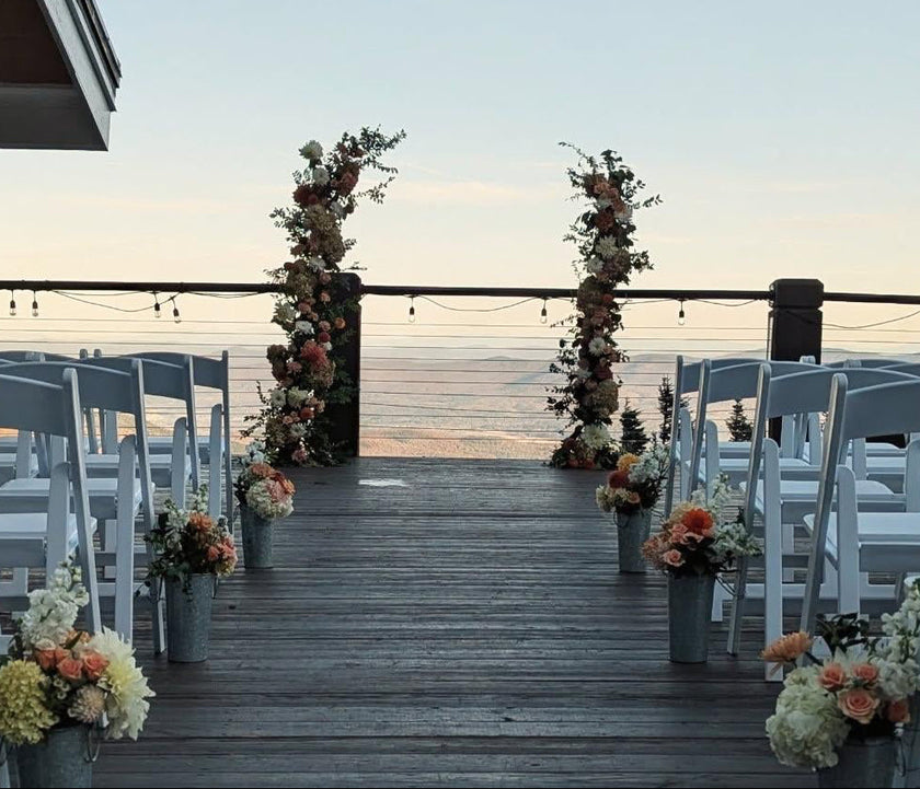 Arbor Design: A combination of fresh flowers and foliage fixated on an arbor provided by the wedding venue. $450 and up